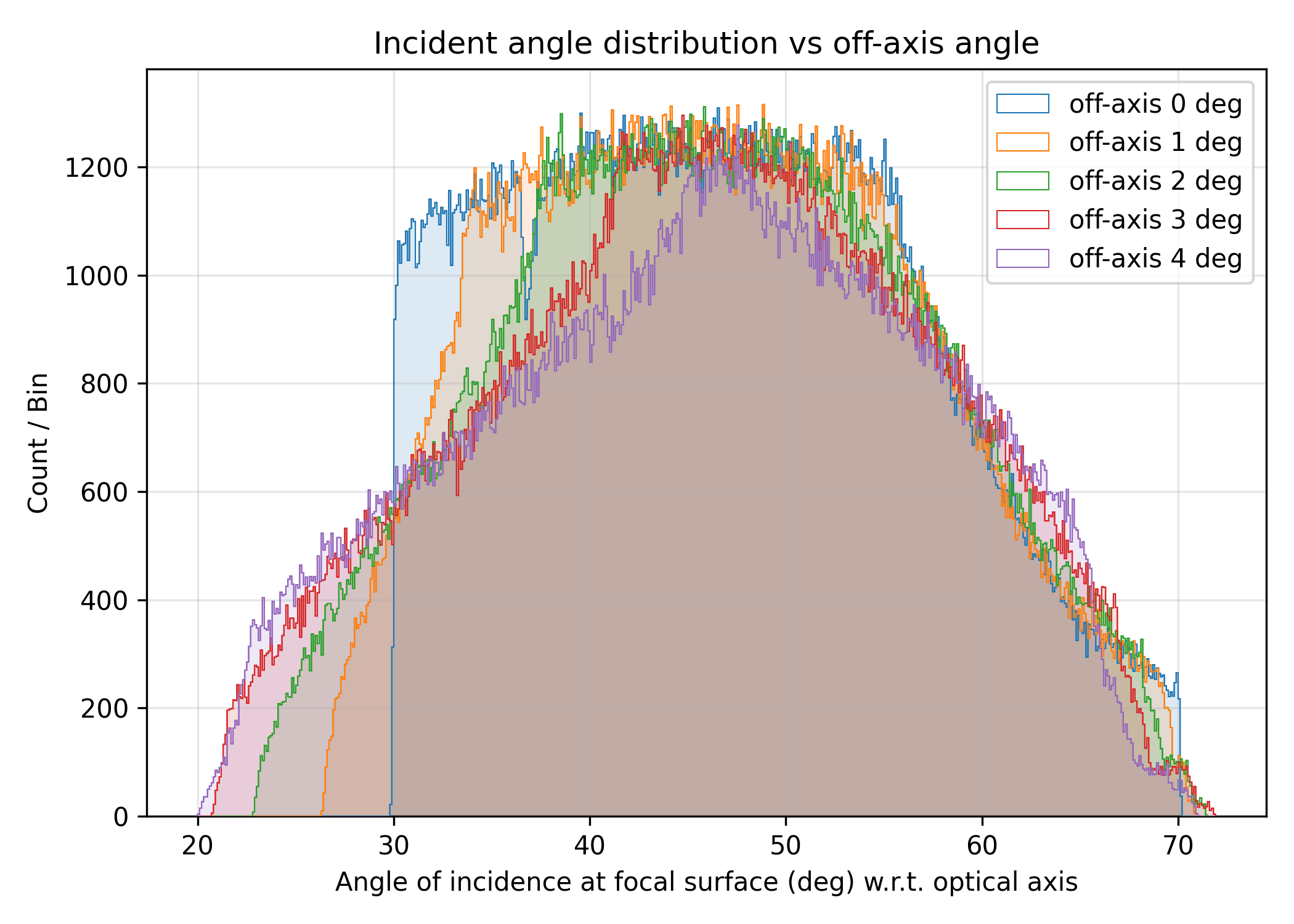 Note also the relation between radius and primary mirror incident angles, and how this relates to the peak seen in the primary mirror incident angle distribution: