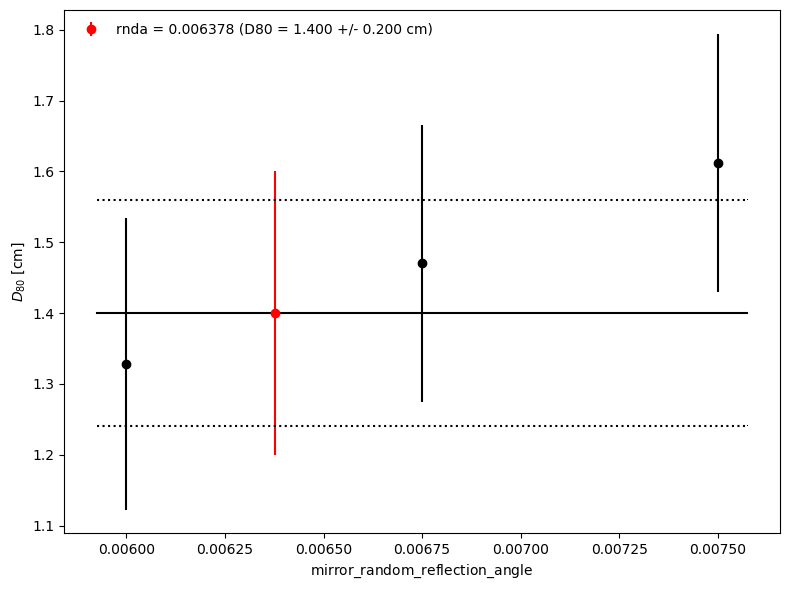 Results of the tuning are plotted. See examples of the PSF containment diameter D80 vs random reflection angle plot, on the left, and the D80 distributions (per mirror panel), on the right.