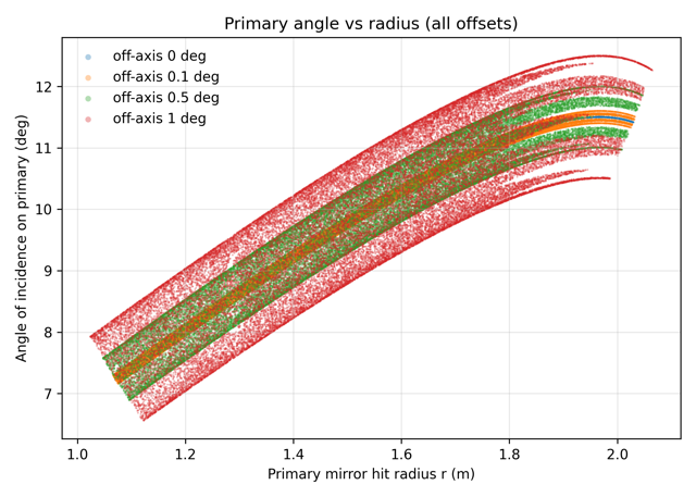 Note also the relation between radius and primary mirror incident angles, and how this relates to the peak seen in the primary mirror incident angle distribution: